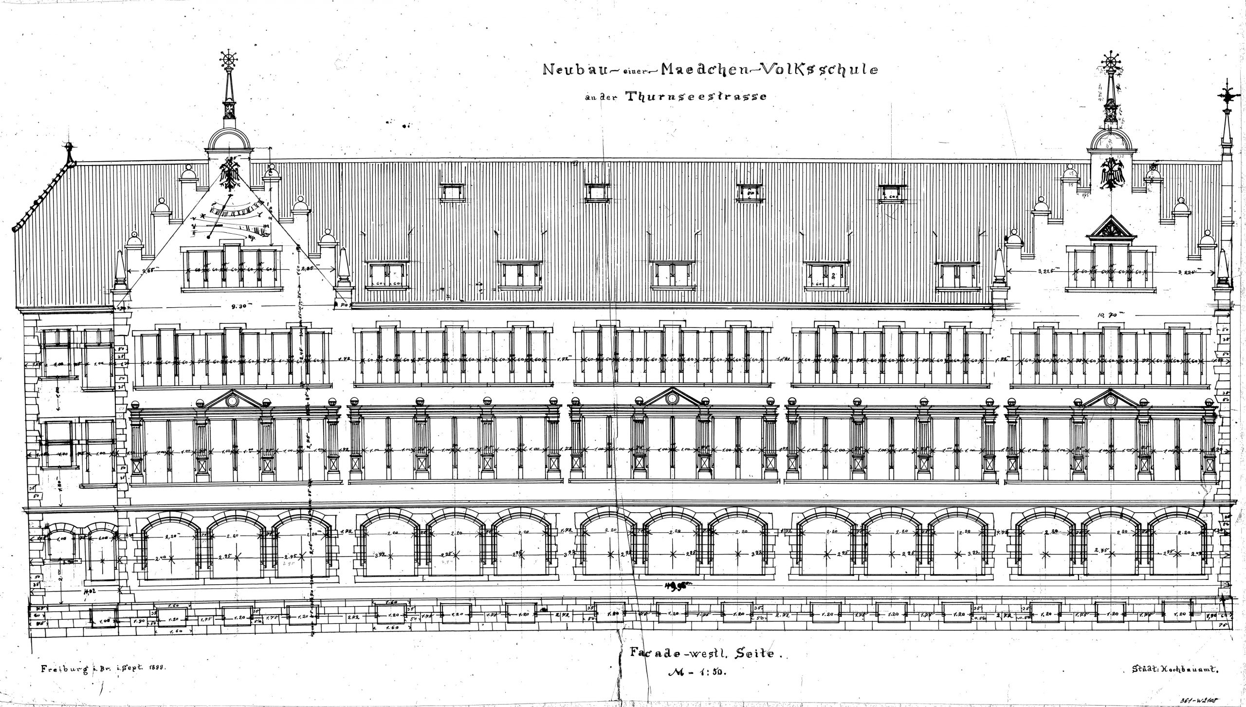 In den Jahren 1899-1902 als reine Mädchenschule im Stil des Historismus erbaut, besitzt die Turnseeschule eine reich verzierte Fassade mit vorgesetzten Säulen und reichem Bauschmuck, die nun behutsam denkmalgerecht saniert werden muss.